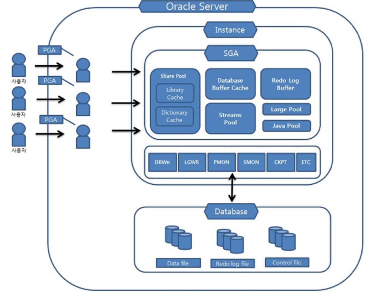 - database buffer cache : 데이터의 조회와 변경 실제작업이 일어나는 공간